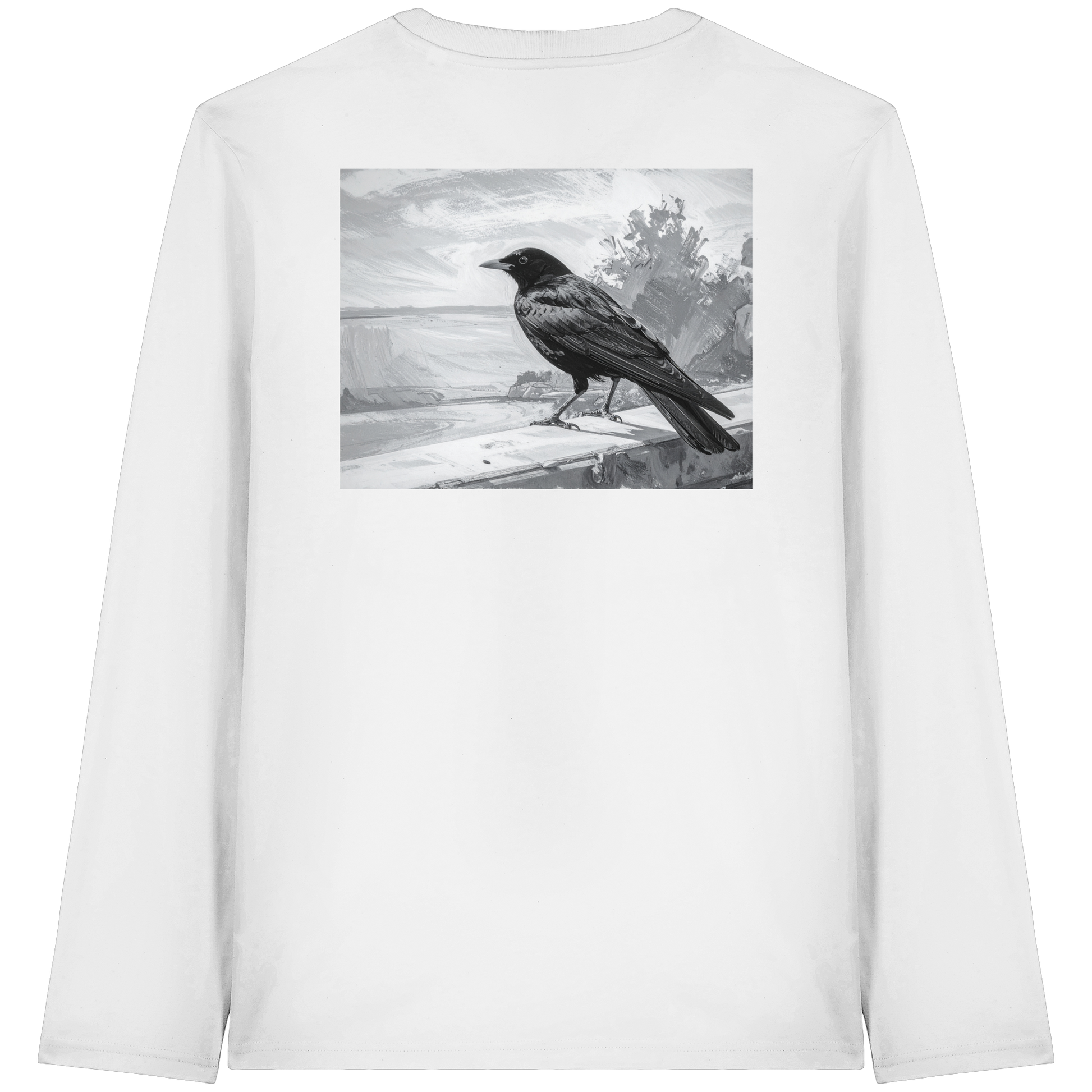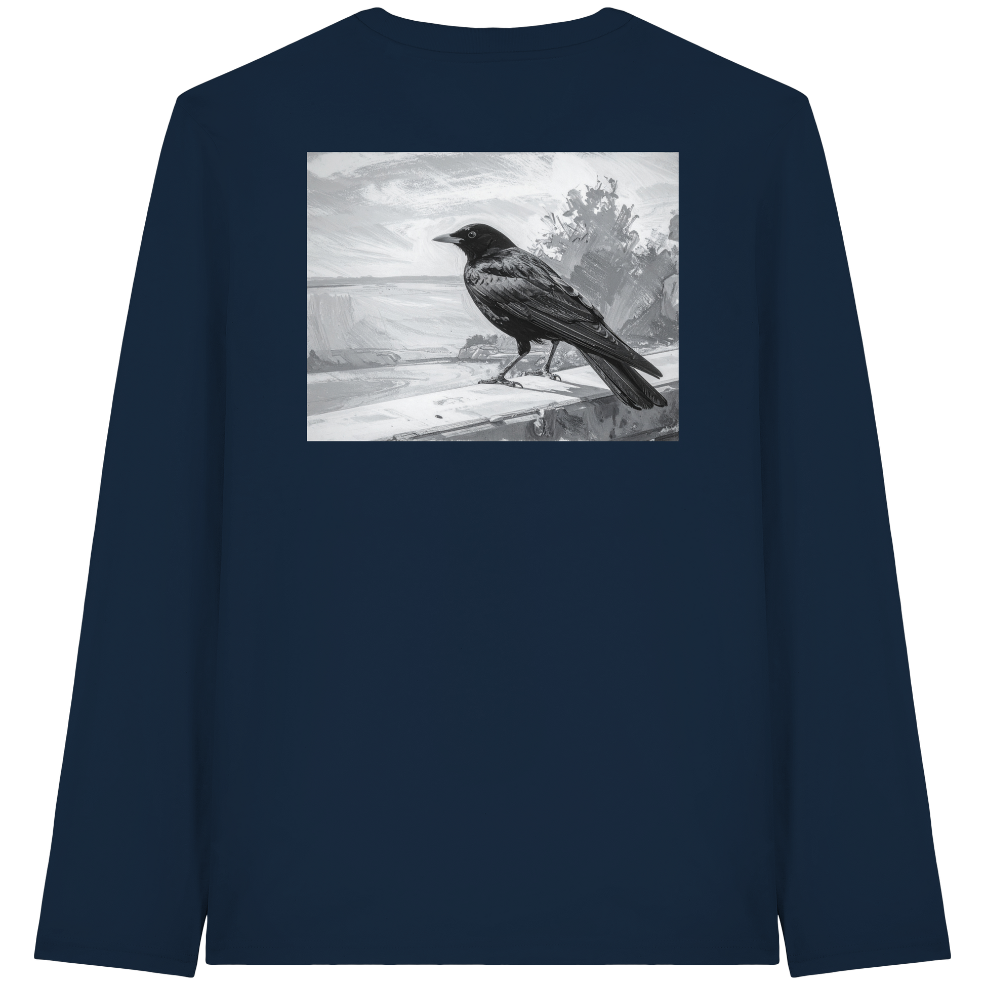 Erlebe die Ruhe und Tiefe der Natur mit unserem Amsel auf der Mauer - Organic Longsleeve T-Shirt. Dieses einzigartige Aquarellmotiv einer Amsel, die auf einer Mauer sitzt und in die Ferne blickt, bringt Gelassenheit und Stil in deinen Alltag.