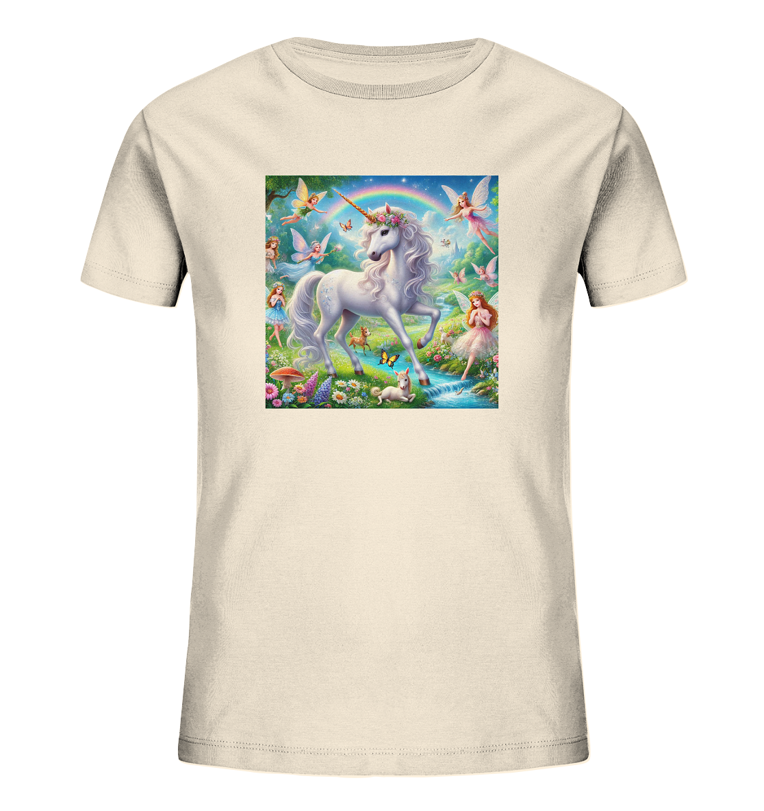 Entdecke die zauberhafte Welt der Fantasie mit unserem 'Einhorn mit Elfen - Kids Organic Shirt'. Dieses Design entführt dein Kind in ein Märchenreich voller Magie und Freude. Ein majestätisches Einhorn, umgeben von tanzenden Elfen, bunten Schmetterlingen und einem funkelnden Regenbogen, weckt die Abenteuerlust und Kreativität.