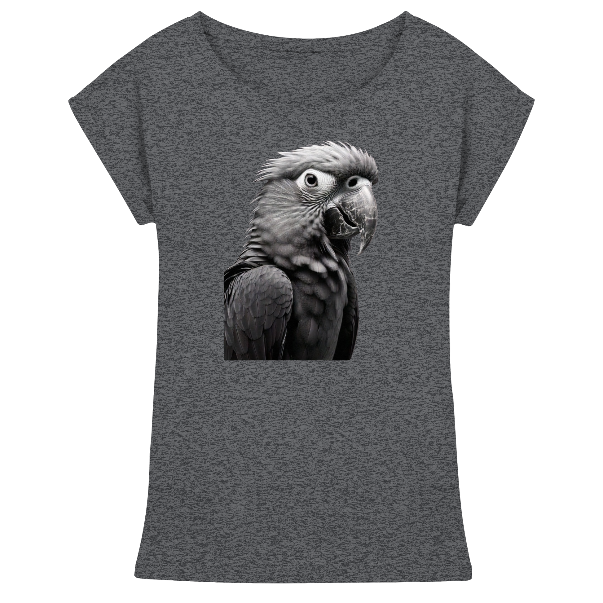 Erlebe das Abenteuer mit unserem Papagei - Porträt - Backprint Womens Extended Shoulder T-Shirt. Dieses Design bringt die exotische Schönheit und den faszinierenden Charme eines Aras in stilvoller Schwarz-Weiß-Ästhetik zur Geltung. Perfekt für alle, die sich nach einer Prise exotischem Flair in ihrer Garderobe sehnen.