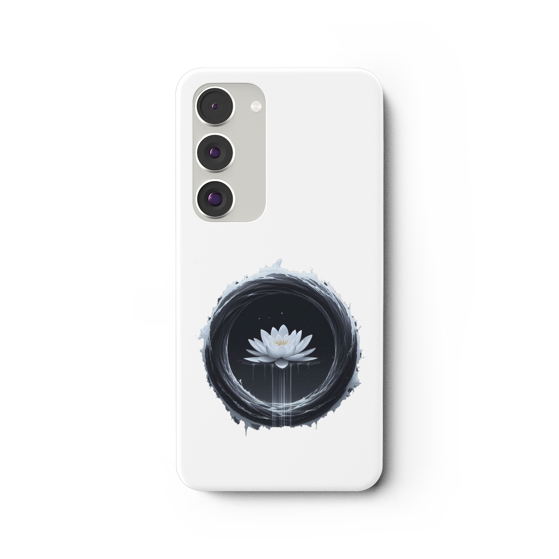 Tauche ein in die faszinierende Welt des Designs mit unserer Handyhülle für das Samsung Galaxy S23 Plus. Das Motiv eines schwarzen Wasserrings, der eine strahlend weiße Seerose umrahmt, vereint Eleganz mit Mystik und schafft eine unvergleichliche Stimmung.